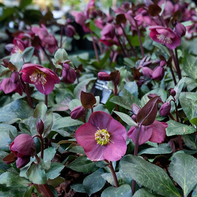 Known for its leather-like handsome foliage with a white marbling effect and its eloquent flowers. Single, rounded, dark burgundy flowers with a crown of creamy stamens, and long sturdy red stems . This unique hellebore, the flowers face outward instead of nodding like other selections of Hellebore. These exquisite beauties bloom heavily for weeks where there is little blooming at this time, from late winter to mid-spring. Deer resistant. Perfect for a sheltered site like shade gardens, shady borders, container gardening, and under trees or large shrubs. A must have for woodland gardens and cottage gardens. For the best visual impact plant in large groups.Hellebores provide nectar for early pollinators.