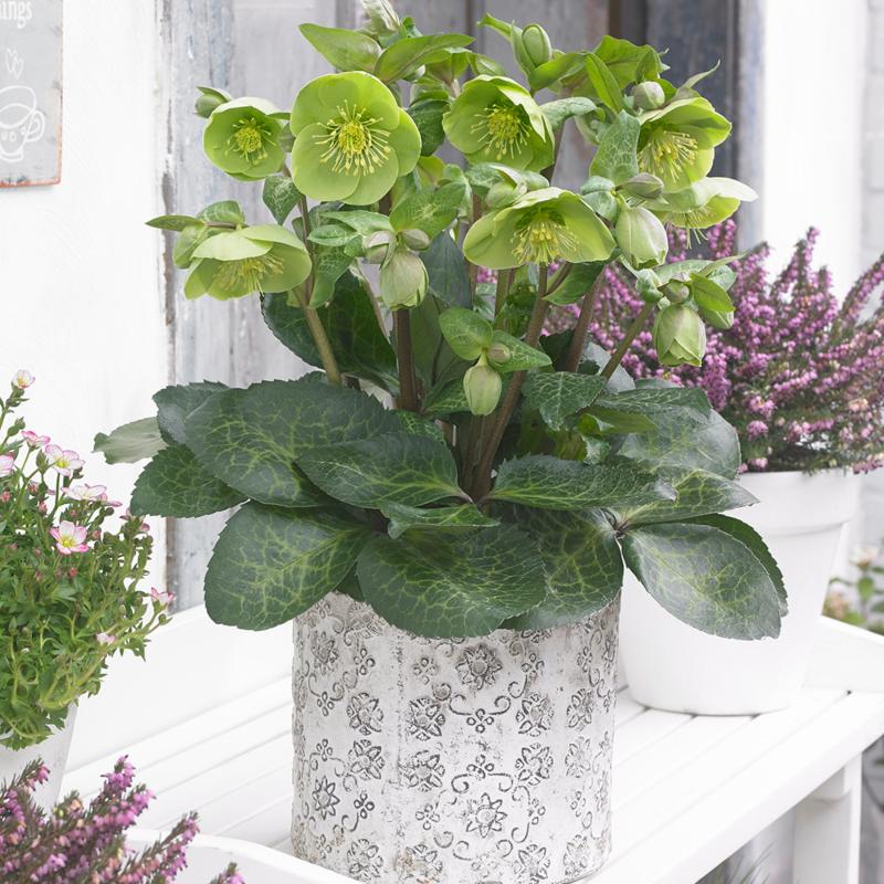 Beautiful and unusual bright green flowers with attractive marbled foliage, flowering from winter to spring, attracting bees to your garden. Offers fantastic bright foliage color to complement other flowering plants