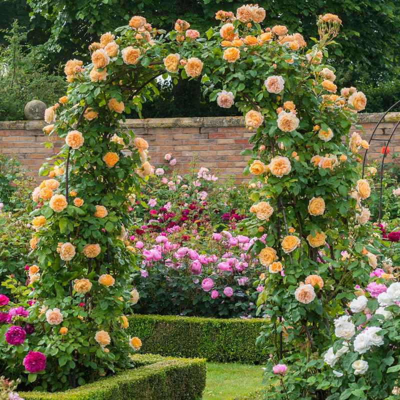 A vigorous climber, bearing quite large, many petalled, neat rosette flowers in a lovely shade of apricot-orange. They have a medium-strong Tea fragrance and are produced with exceptional freedom and regularity. There is plentiful, glossy foliage.