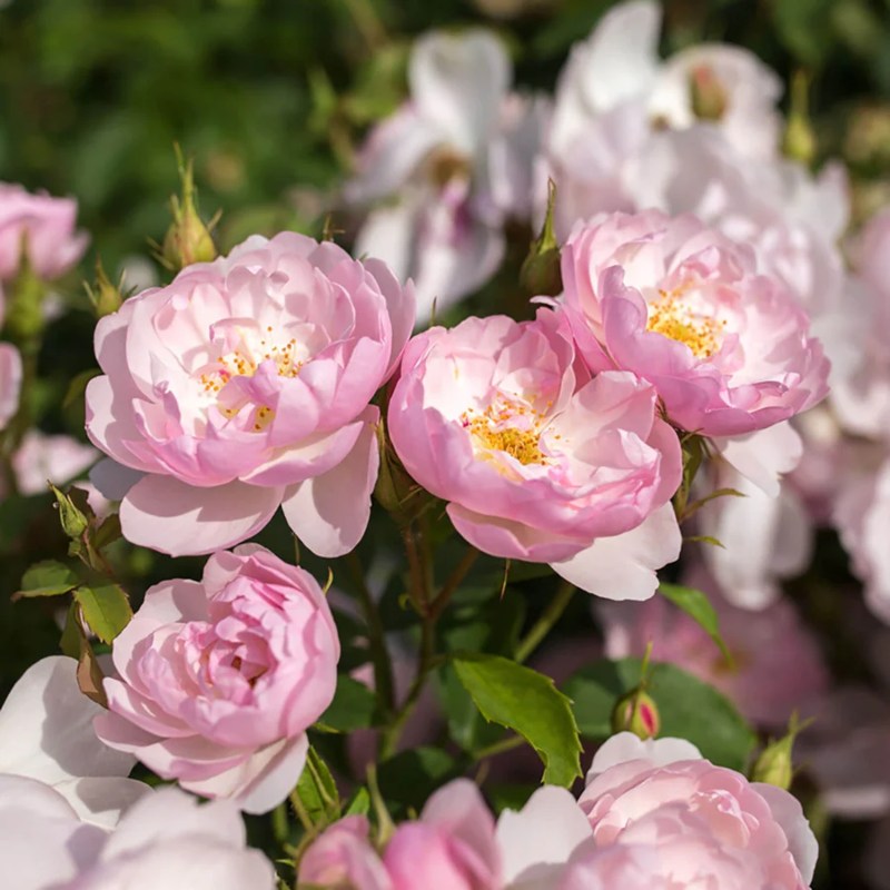 Despite giving the impression of utmost delicacy, this is a very tough, healthy and reliable variety. Extremely floriferous; its soft pink, semi-double flowers are held in large sprays and have a musky Old Rose scent. It forms a bushy, rather upright shrub.