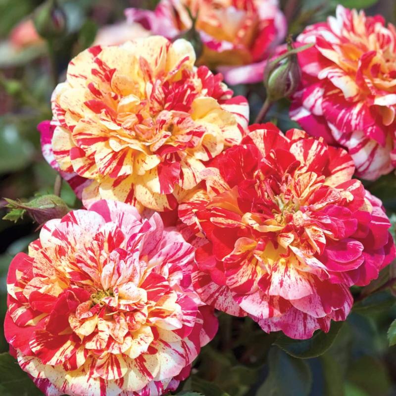 A Grandiflora rose with a unique color combination. Less fragile than other striped roses when it comes to disease resistance and hardiness. The double flowers emerge in stripes of bright red and yellow and fade to pink and cream.