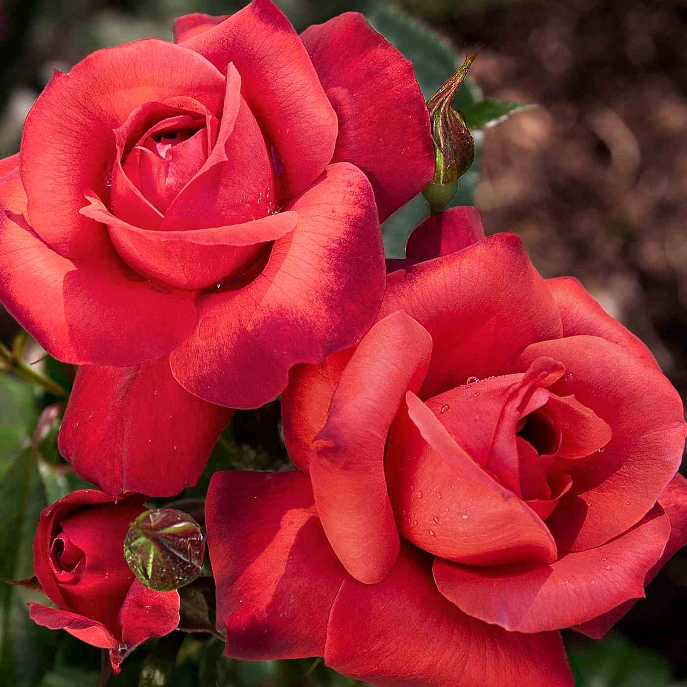 The colorful red hues of this rose vary depending on climate, often presenting as chocolate, brick, or russet. Easy to grow.